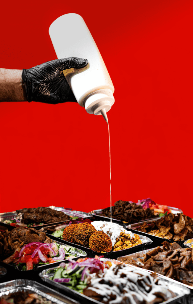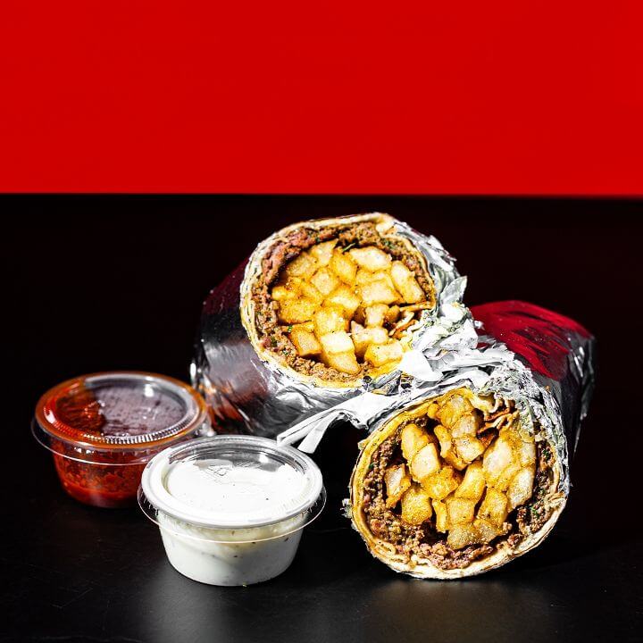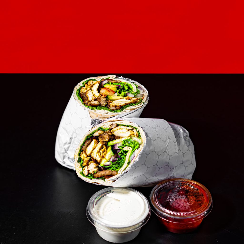 A mix of gyro and chicken shawarma wrapped in pita bread with lettuce, tomato, and onions. Topped with our white sauce and hot sauce.