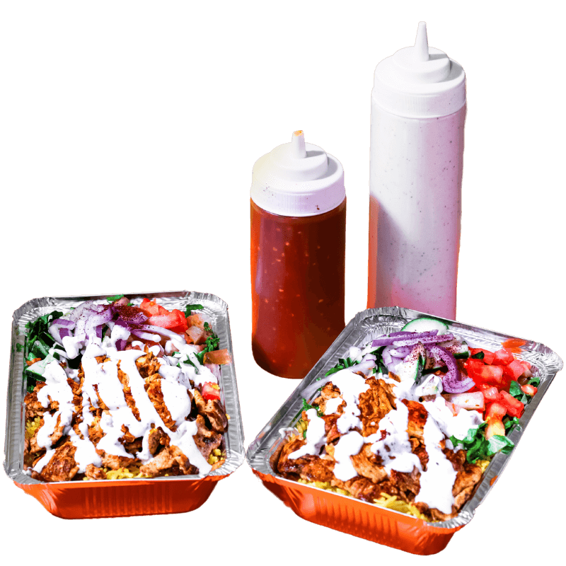 Chopped and marinated grilled chicken thigh and gyro over seasoned basmati rice and a side salad. Topped with our house-made white sauce.