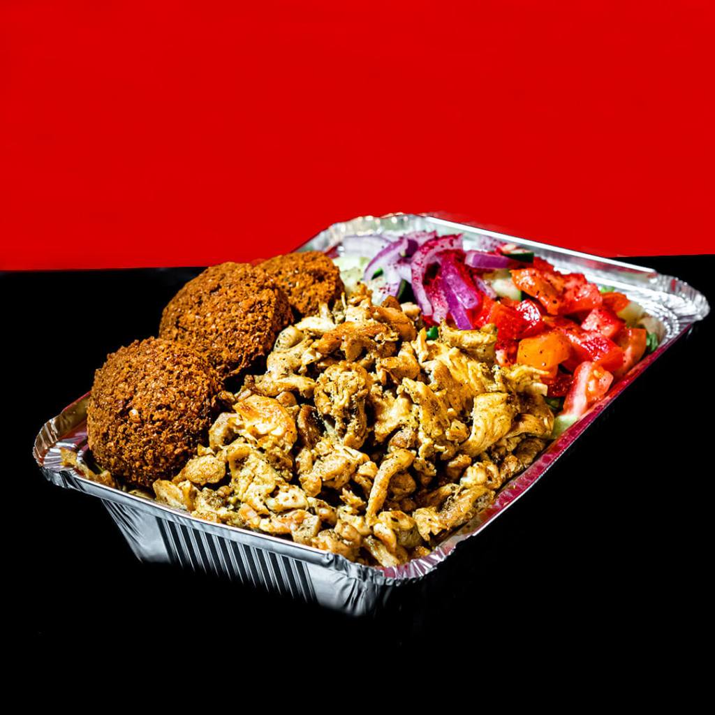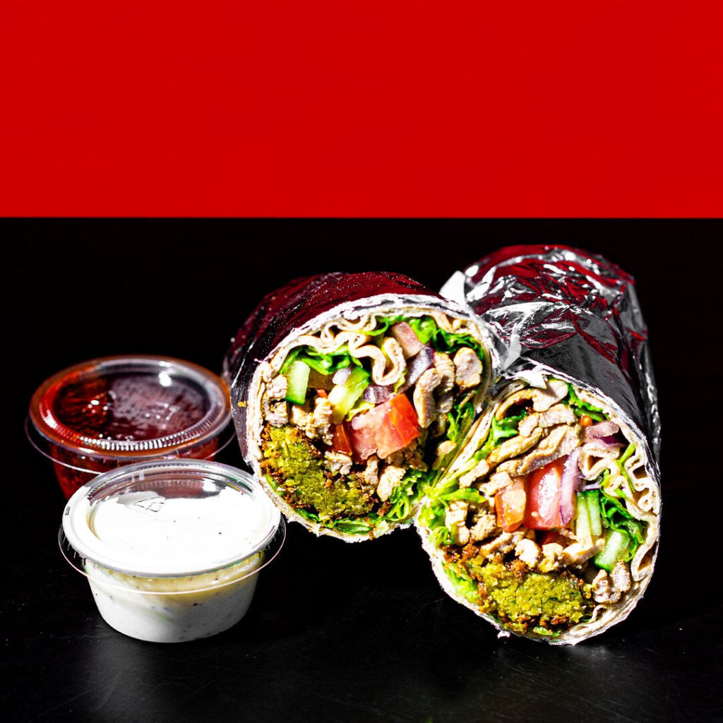 Marinated chicken and crispy falafel wrapped in pita bread with lettuce, tomato, and onions. Finished with our white sauce and hot sauce.
