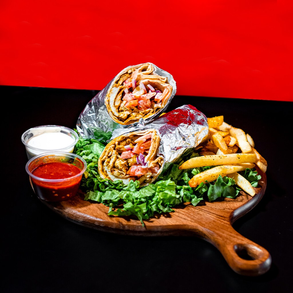 Marinated chicken breast cubes grilled and wrapped in pita bread with lettuce, tomato, cucumber, onions and our white sauce and hot sauce.