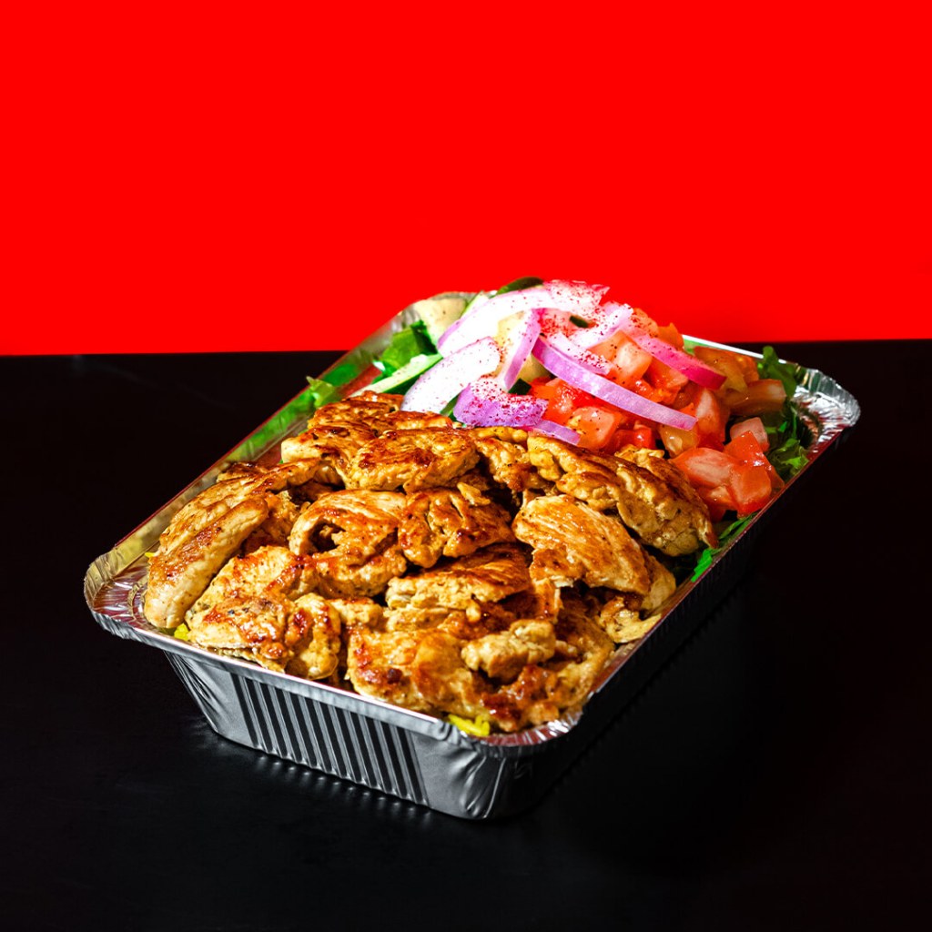 Marinated chicken, thin sliced and wrapped in pita bread with lettuce, tomato, and onions. Finished with our white sauce and hot sauce.