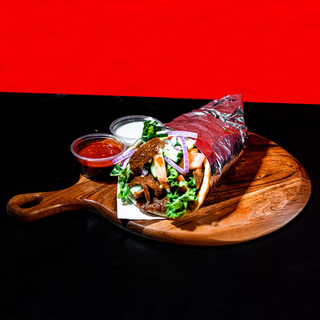 Marinated lamb, thin sliced wrapped in a pita bread with tomato, onions, and our white sauce and hot sauce.